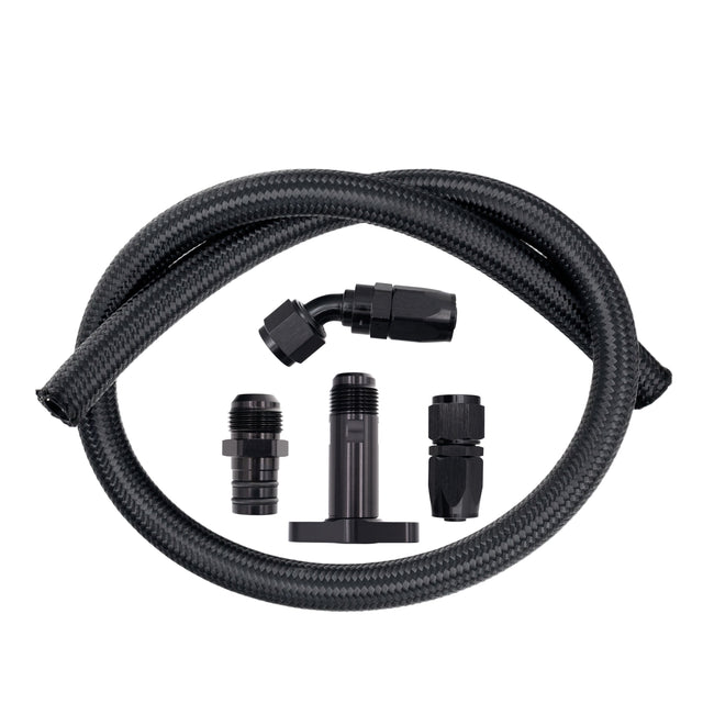 Please note, you will need to measure, cut and assemble this hose. This is not a premed hose kit. Including is FSD's high Flow -12AN Turbo Drain Flange & Block fitting. FSD's High Flow Fittings flow more than any other products on the market.